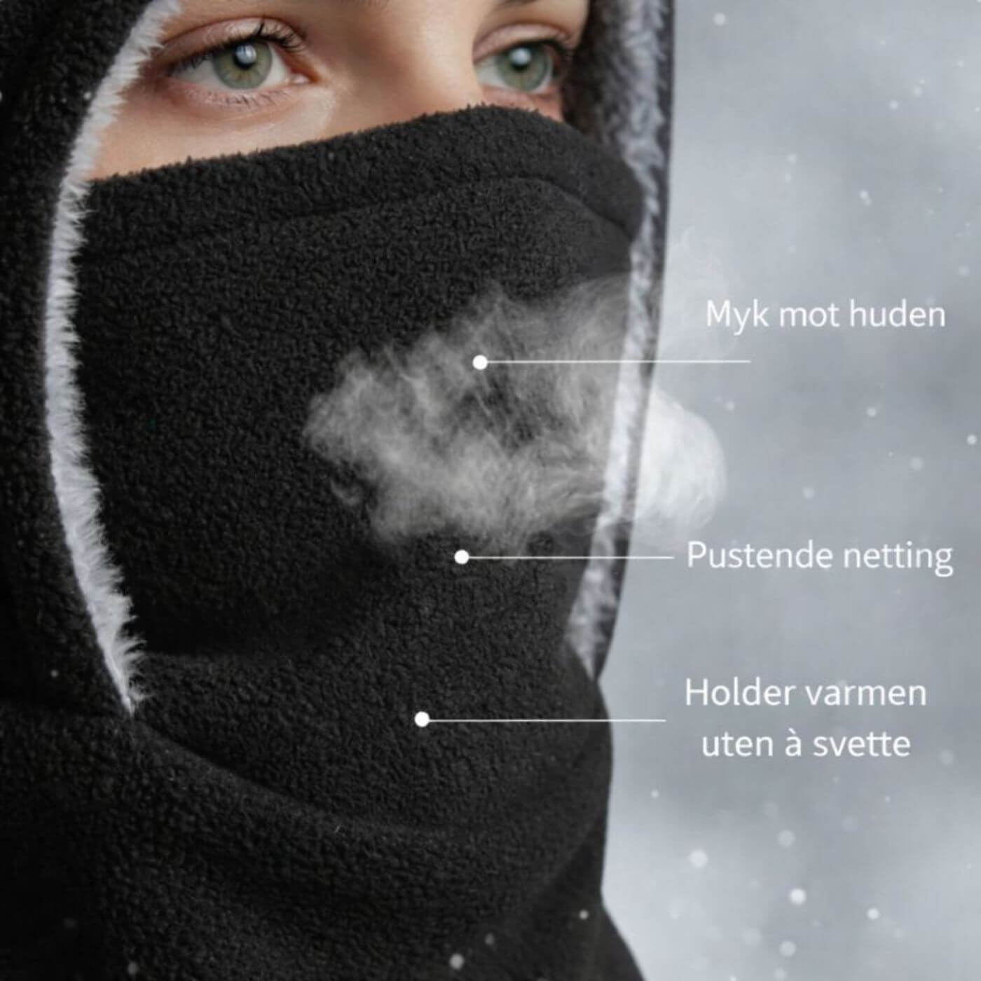 ThermoWrap™ er laget for dager der kulden virkelig biter. Den beskytter hode, hals og ansikt uten å føles tett eller klam. Perfekt for vinterturer, utendørs arbeid eller lange dager i kaldt vær.